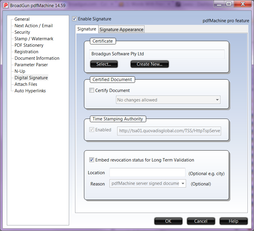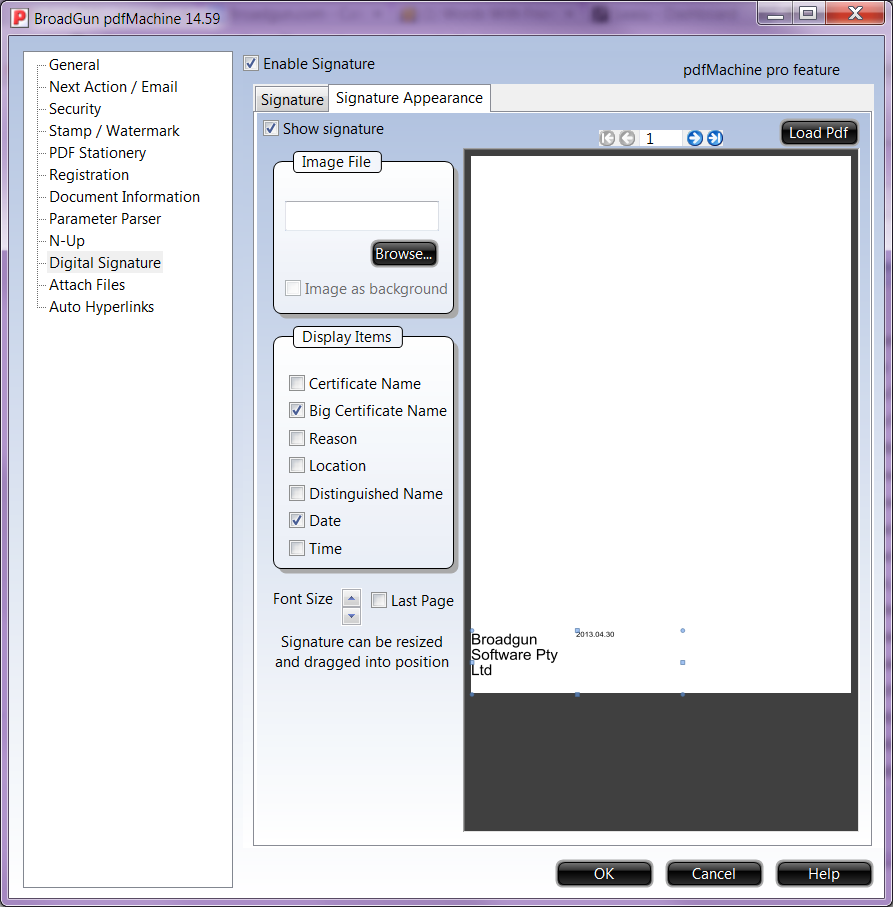 When enabled from the options, pdfMachine will automatically place a digital signature in PDF files as they are