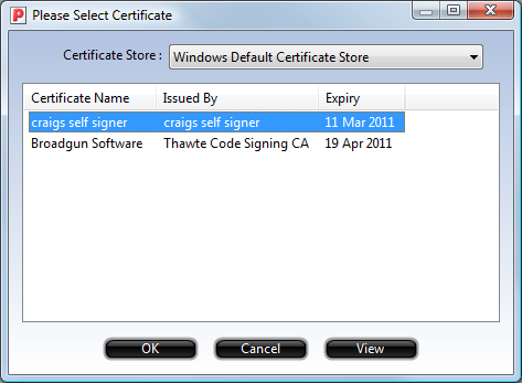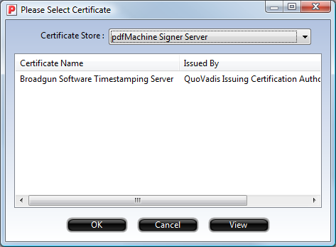 This is a list of certificates that reside on pdfMachine servers that you can use to sign your PDFs. This works without sending the PDF to the pdfMachine servers. Only a 20 byte "message digest" of the PDF is sent to the server, where it is signed and time stamped. The signature is then sent back to the client machine to and inserted into the PDF. Windows Certificate Store
