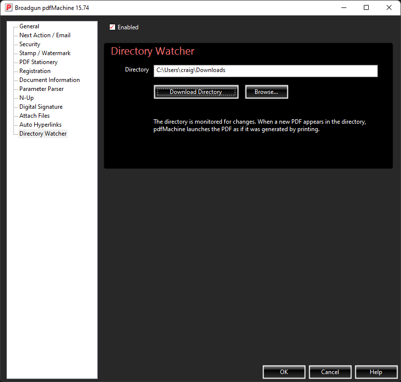 The directory specified will be monitored for changes. When a new PDF appears in the directory, e.g. as a result of a browser download, pdfMachine automatically opens the PDF.