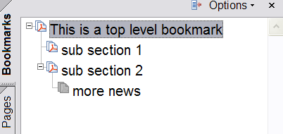 A back slash separated list of heading names, forming a table of contents or bookmark hierarchy. Bookmarks provide a table of contents and usually represent the chapters and sections in a document. Bookmarks appear in the navigation pane of adobe reader. When a bookmark is clicked, the reader will be presented with the section where the "bm" command was placed. e.g #_ bm This is a top level bookmark _# #_ bm This is a top level bookmark\sub section 1 _# #_ bm This is a top level bookmark\sub section 2\more news _# Produces PDF with a bookmarks window in Adobe Reader: