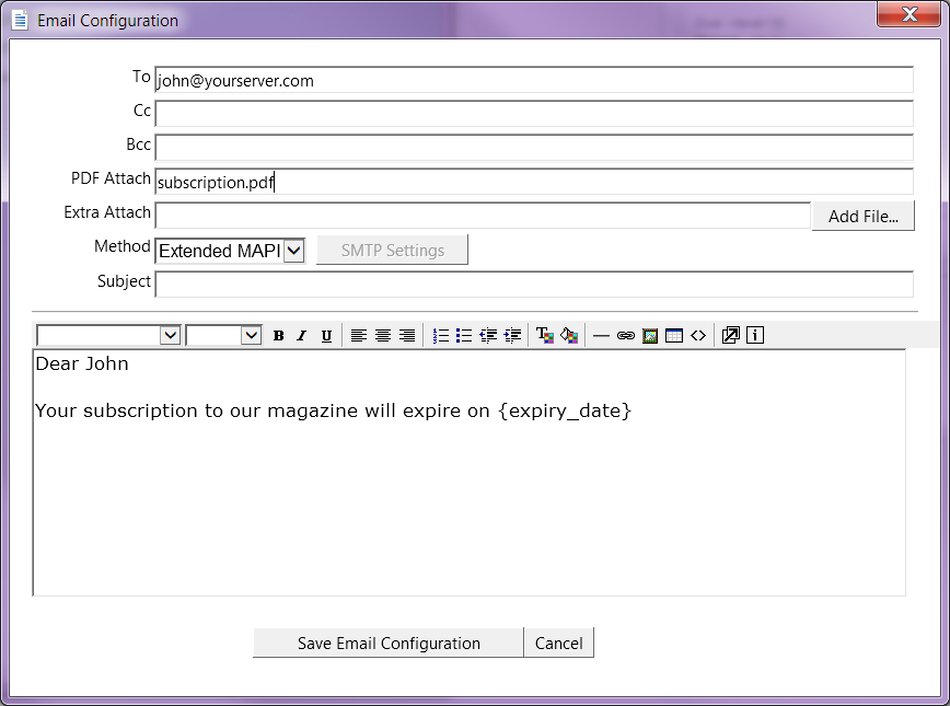 Or you can do the whole thing using parameter parsing. You do not need to setup all of the details in the Email Configuration options. The MergeField parameter must come after any parameter parsing commands that use the MergeField. You can print the following text to pdfMachine to send an email to john@yourserver.com, with the attachment called "subscription.pdf" and the subject "Subscription expires on 1st March 2019" and the body "Dear John Your subscription to our magazine will expire on 1st March 2019" (spread over 2 lines).