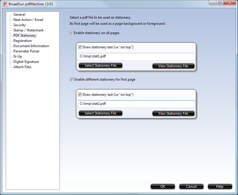 Stationery allows you to use the first page of an existing PDF file as stationery. The first page of the stationery PDF file will be merged on to every page of the resulting PDF file.