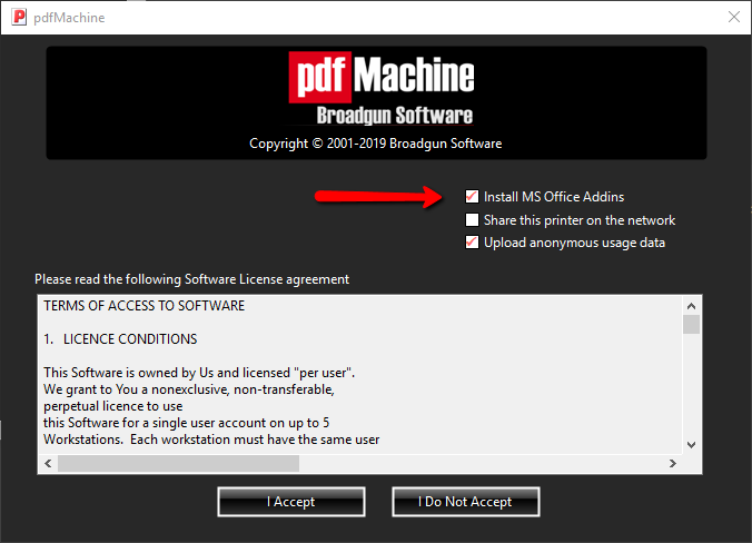 If you want to convert Microsoft Office documents to PDF using any of the pdfMachine products then make sure you install the pdfMachine office addin by checking the "Install MS Office Addins" checkbox.