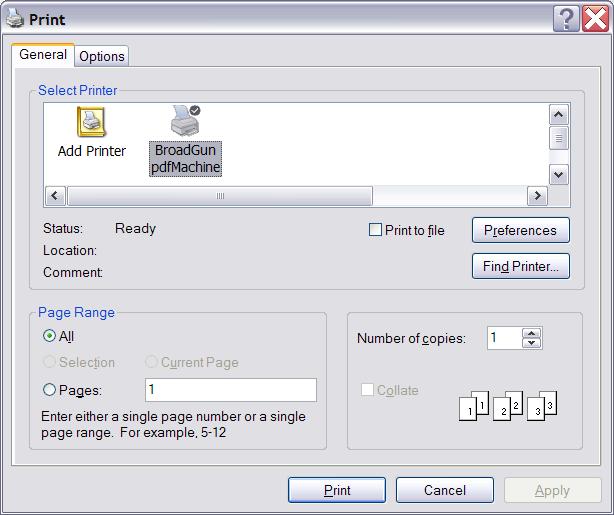 3. Select the 'Broadgun pdfMachine' printer from the list of printers and press the 'Print' button.