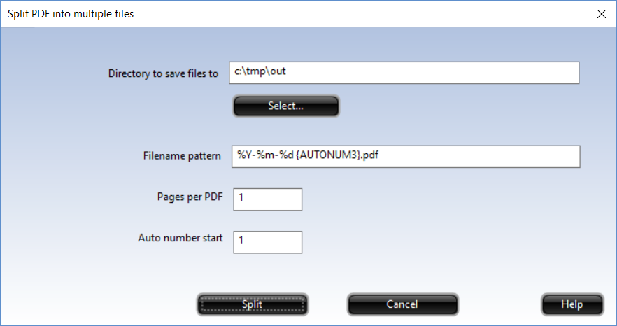 This dialog is invoked from the file menu option, 'Split PDF into many PDFs...'.