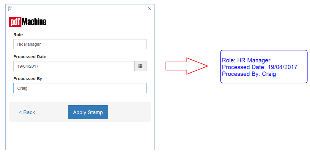 The pdfMachine stamper dialog is a convenient way to apply a filled out form onto a PDF. It can be invoked from the Tools menu in Edit Mode. It can also be automatically launched upon PDF generation by setting the option "Next Action" to "Launch Stamper".